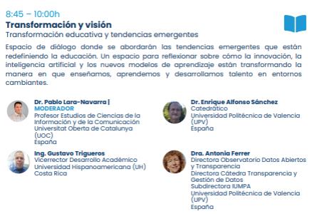 Este debate fue uno de los ejes centrales del V Simposio Internacional en Simulación de Negocios e Innovación Educativa, celebrado los días 27 y 28 de noviembre en Costa Rica. Durante la sesión titulada “Transformación educativa y tendencias emergentes” (8:45–10:00h), se abrió un espacio de reflexión y diálogo que reunió a referentes académicos: